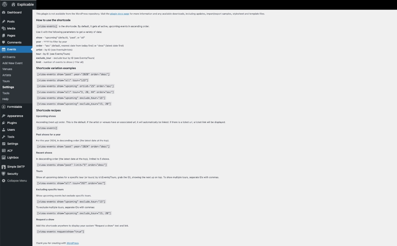 Vizou Events Manager is dependent upon the very popular free (or Pro) version of the Advanced Custom Fields (ACF) plugin from WP Engine.