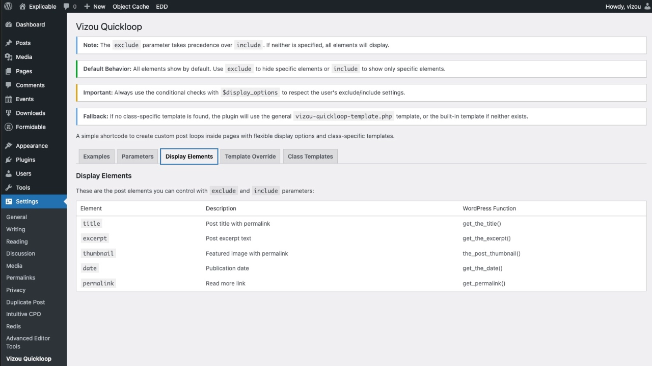 Class-specific template support – use different templates for different layouts by creating files like vizou-quickloop-template-gallery.php or vizou-quickloop-template-featured.php in your theme